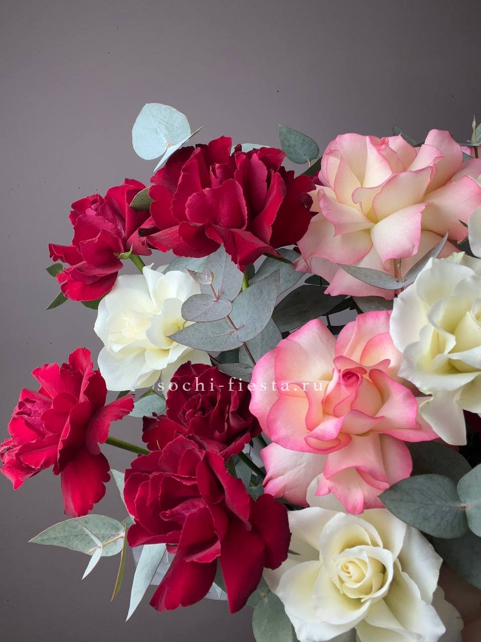 Семь пионовидных роз образуют компактный букет с мягкими линиями и спокойным ритмом. Ветви эвкалипта добавляют воздушности и завершают композицию.