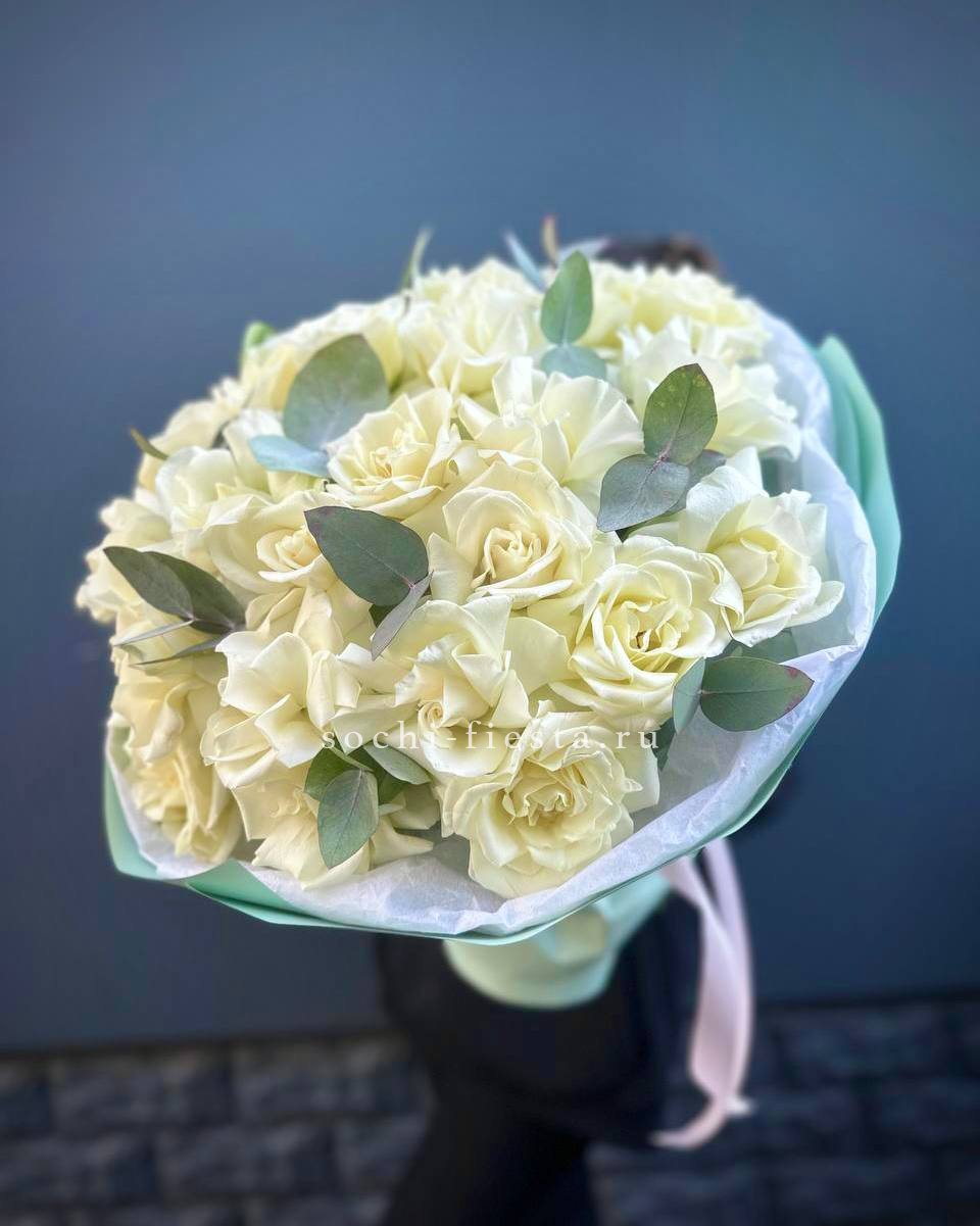 15 белых роз, лента, крафт.