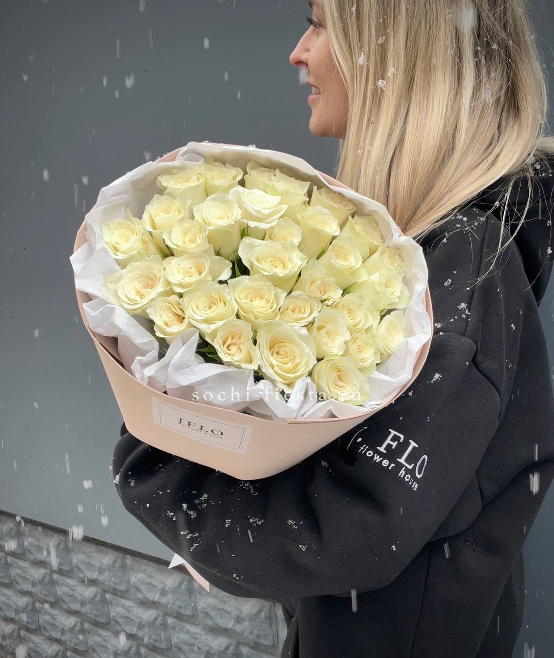 Тридцать один белый бутон формирует внушительную композицию, которая привлекает внимание своим присутствием. Букет выглядит цельно и заполняет собой любое пространство.