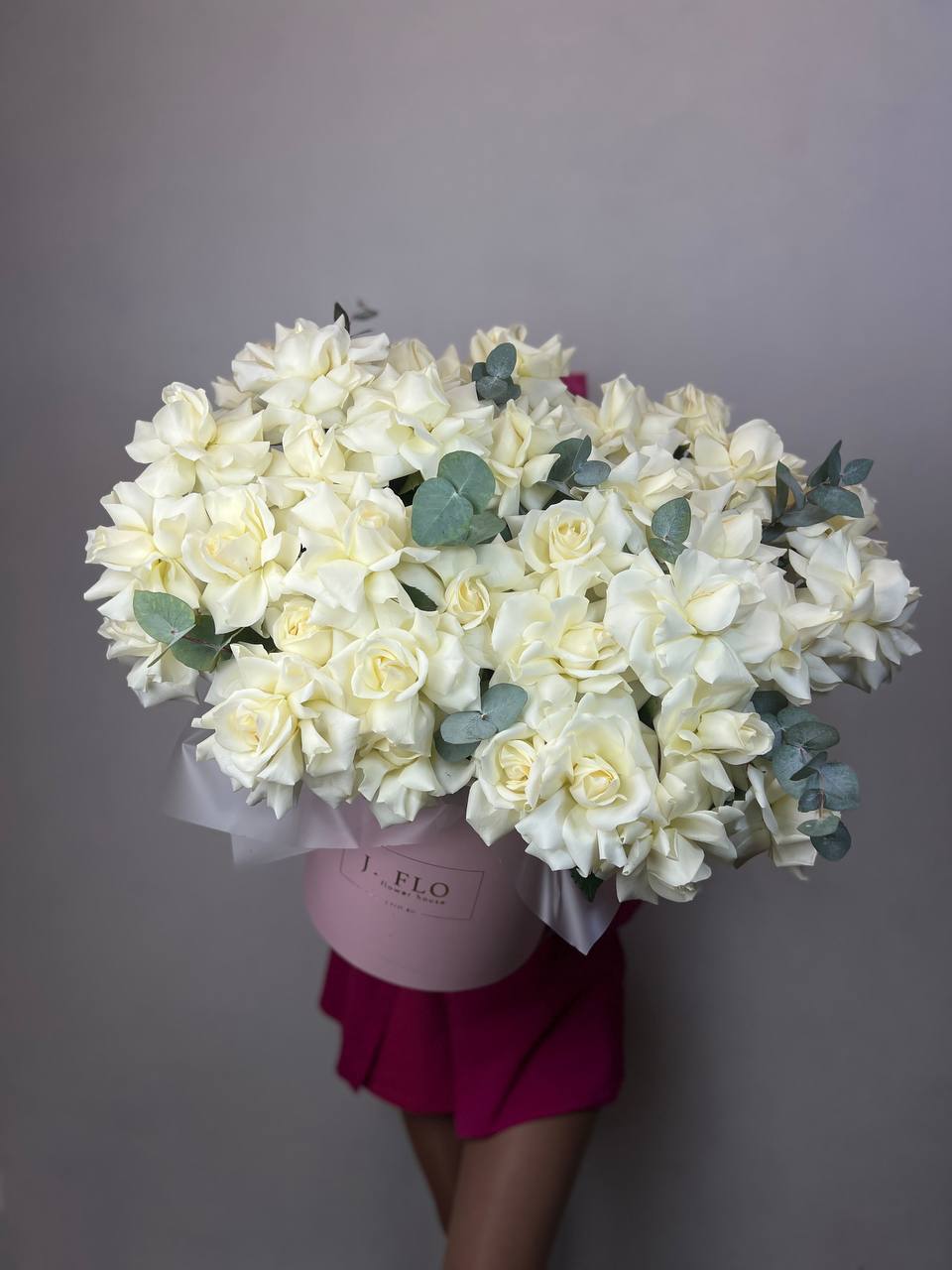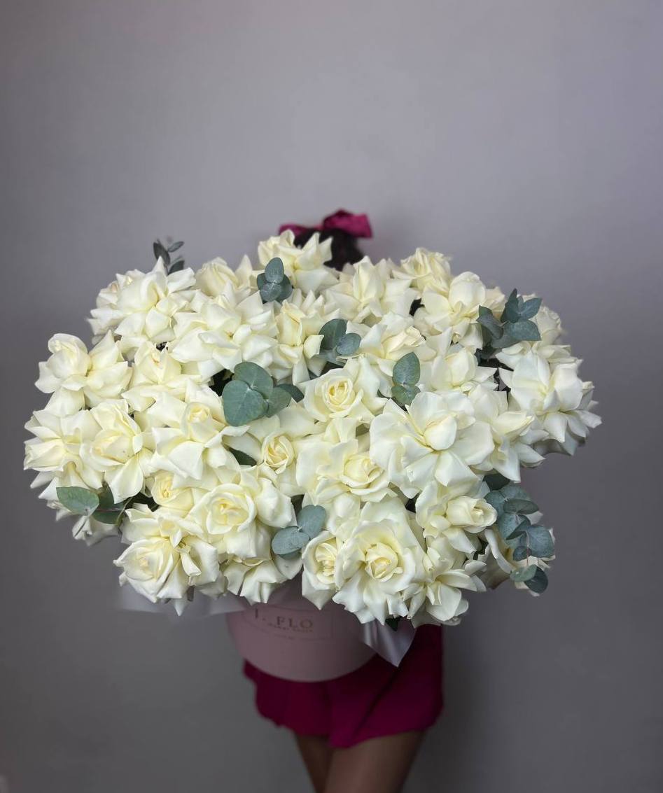 Пятнадцать белых роз собраны в плотный букет с чистыми линиями. Прозрачная упаковка сохраняет свежесть и открывает естественную красоту бутонов.