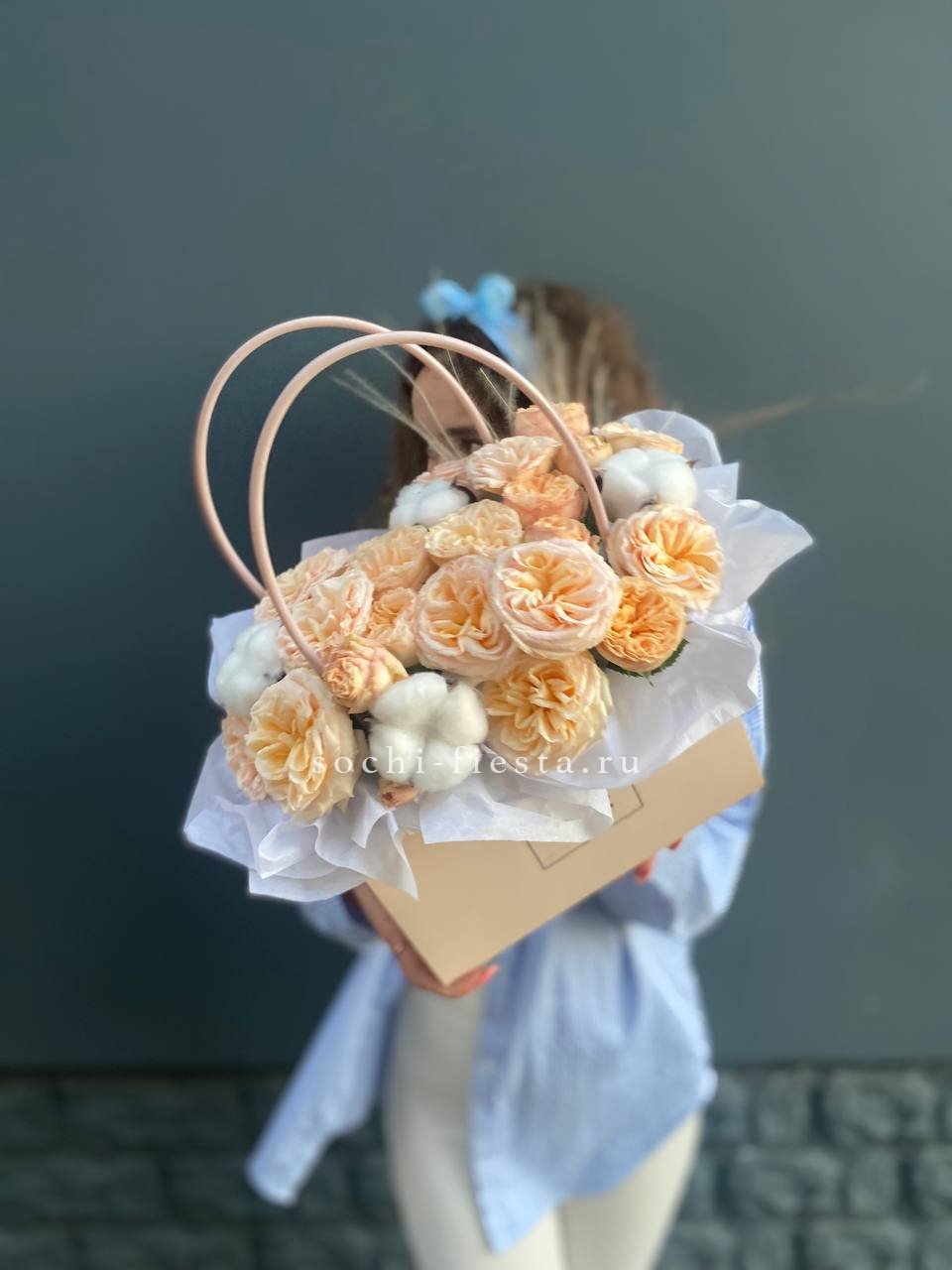 Кустовые розы сорта Джентл с пушистыми коробочками хлопка создают спокойную гармонию в компактной сумочке. Простая композиция для тех, кто любит естественность без лишних деталей.