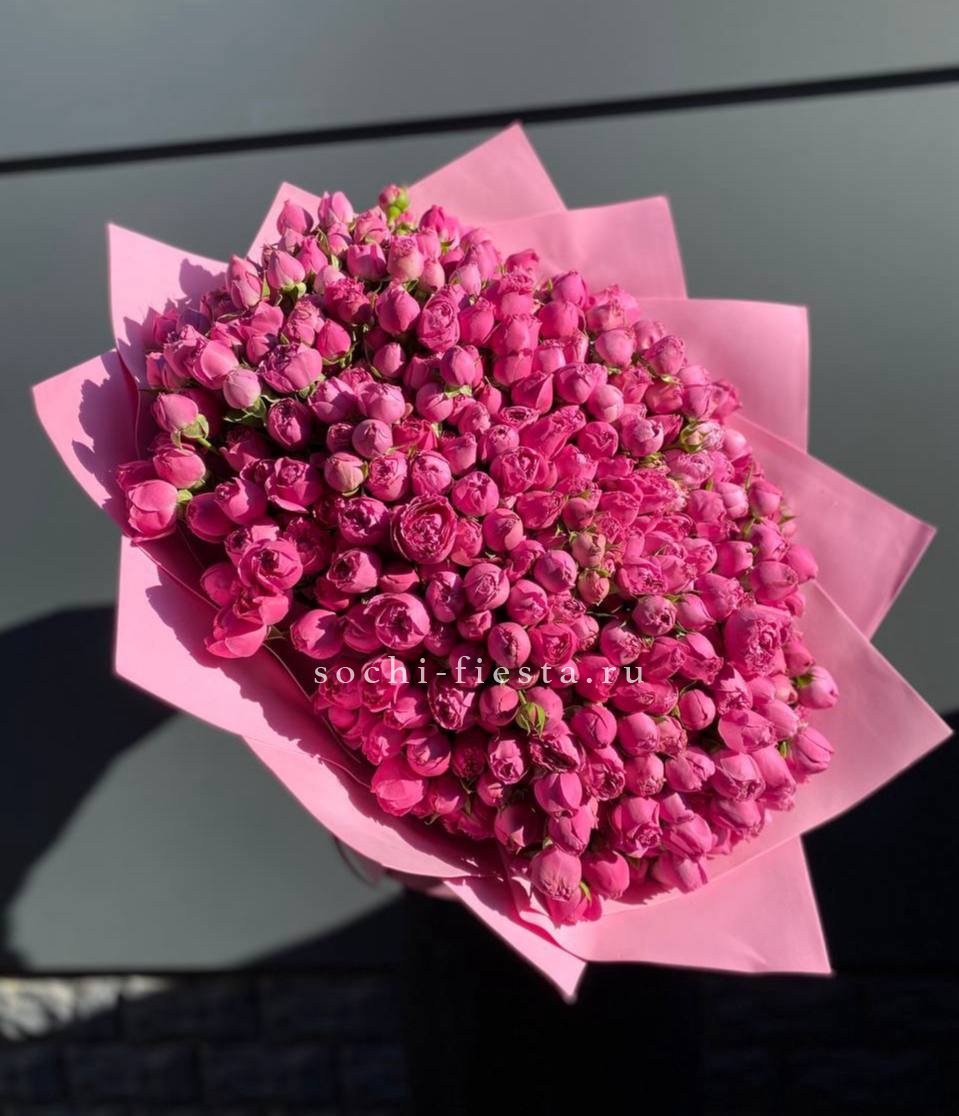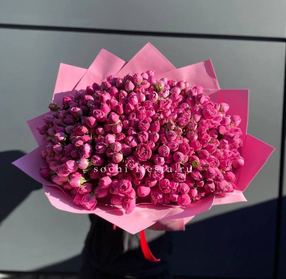кустовые пионовидные розы, альстромерии, тишью, пленка и лента.