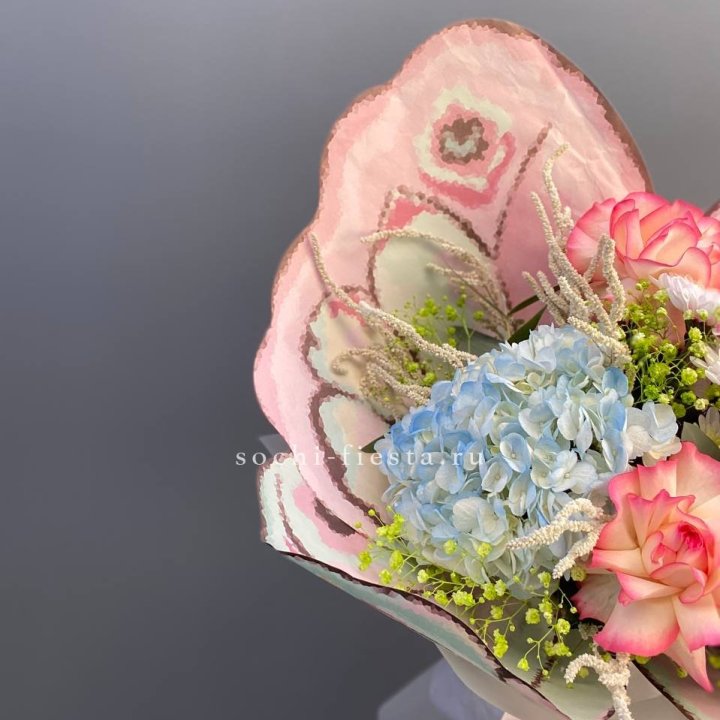 сборный букет из роз и альстромерии для небольшого города в красивой упаковке