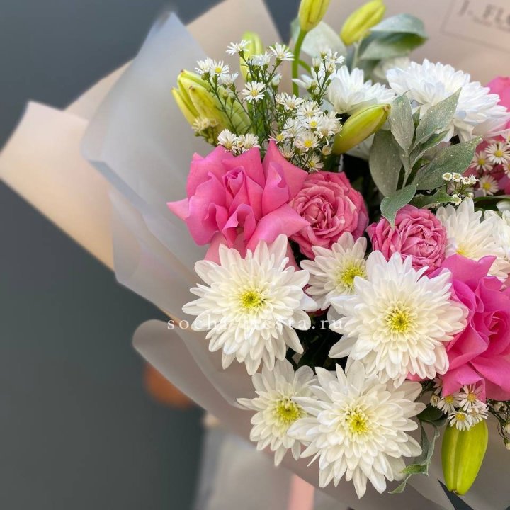 сборный букет из роз и хризантем для подарка в небольшом городе