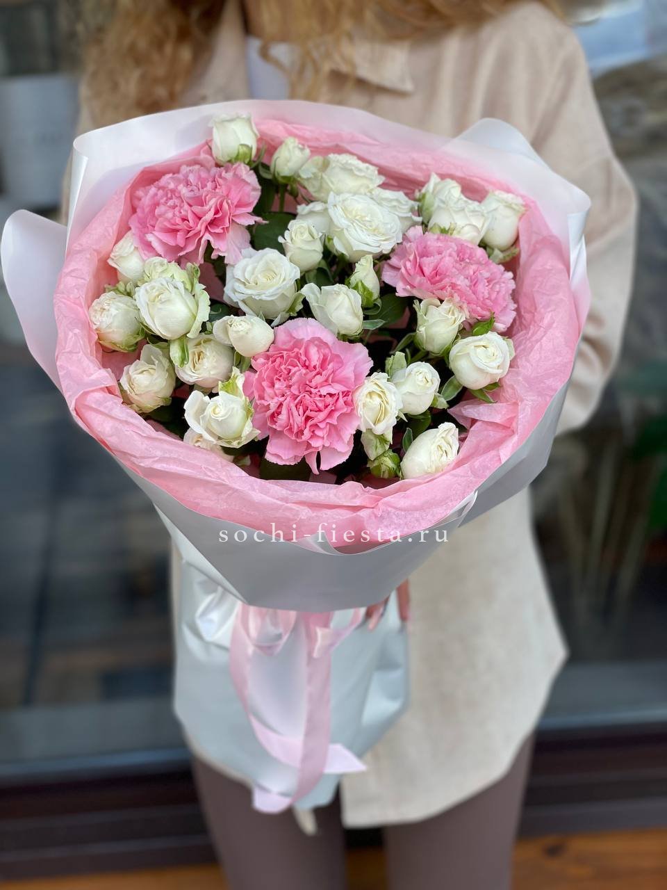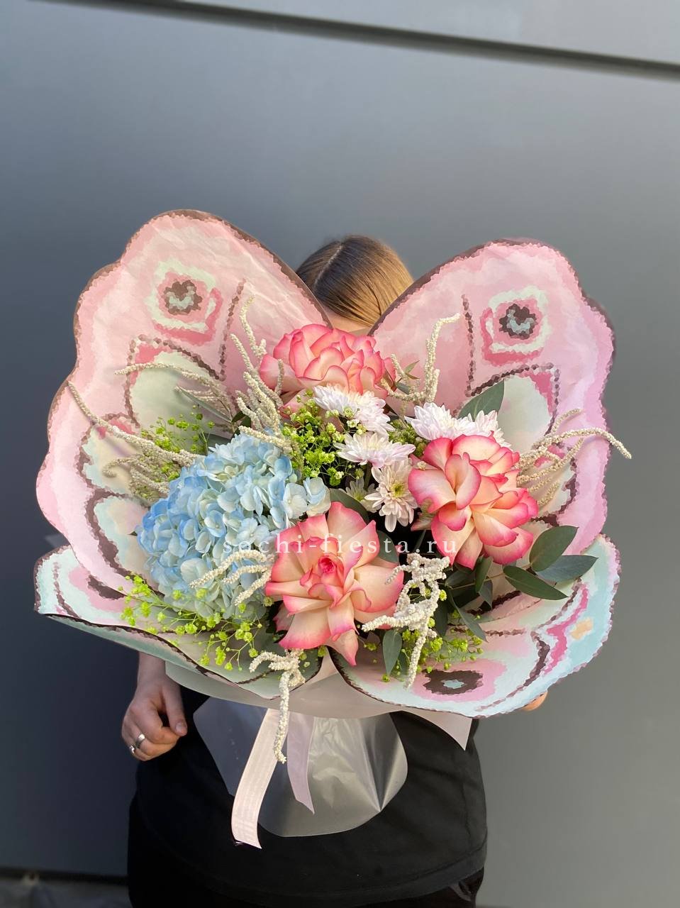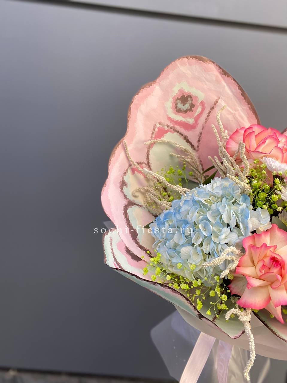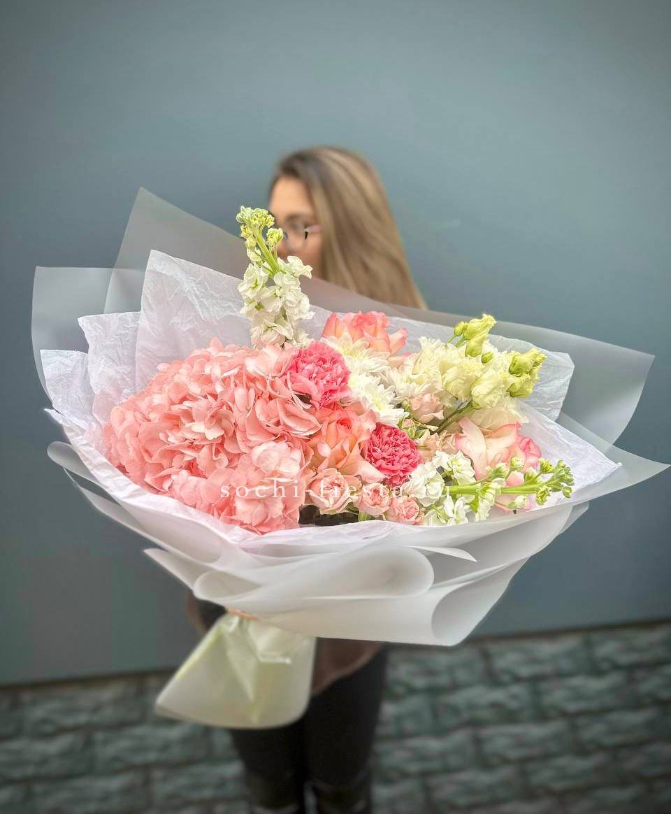 маттиола, розы, гортензия, диантусы, хризантемы , лента и дизайнерская пленка.