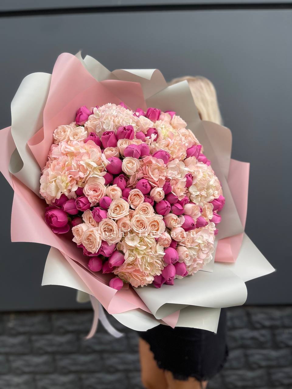 Белоснежная гортензия окружает махровые розы сорта Мисти Бабблс с их густыми лепестками. Композиция построена на игре фактур: воздушные соцветия соседствуют с плотно набитыми бутонами.