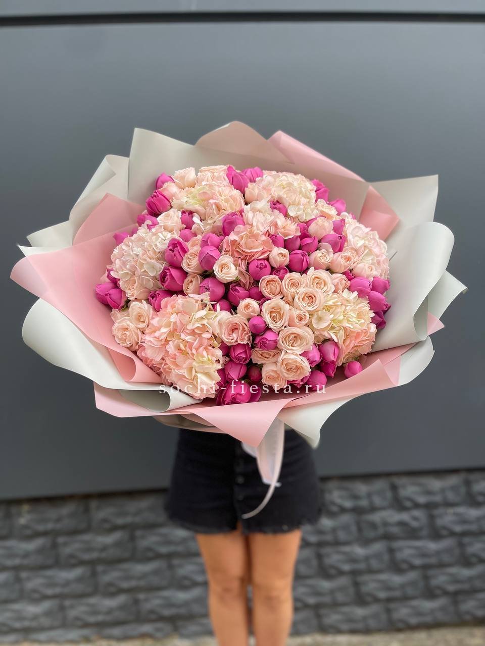 гортензия белая голландская, пионовидная роза Мисти Бабблс, оформление.