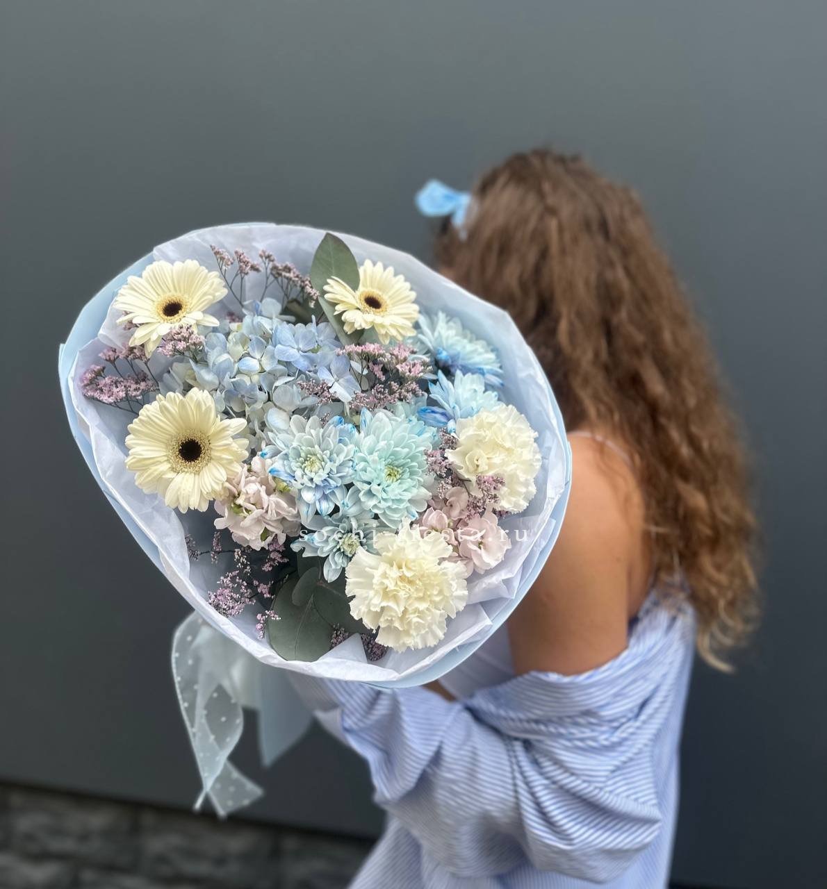 Плотная сборка с пышными соцветиями гортензии и яркими герберами создает объемный силуэт. Маттиола и лимониум добавляют воздушности по краям, а диантусы заполняют центр мягкими переходами.