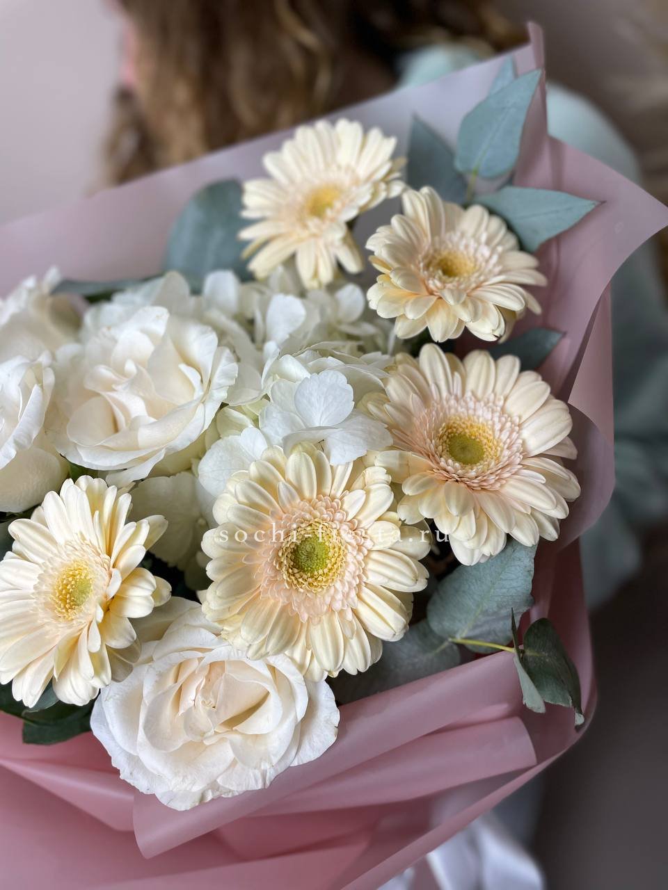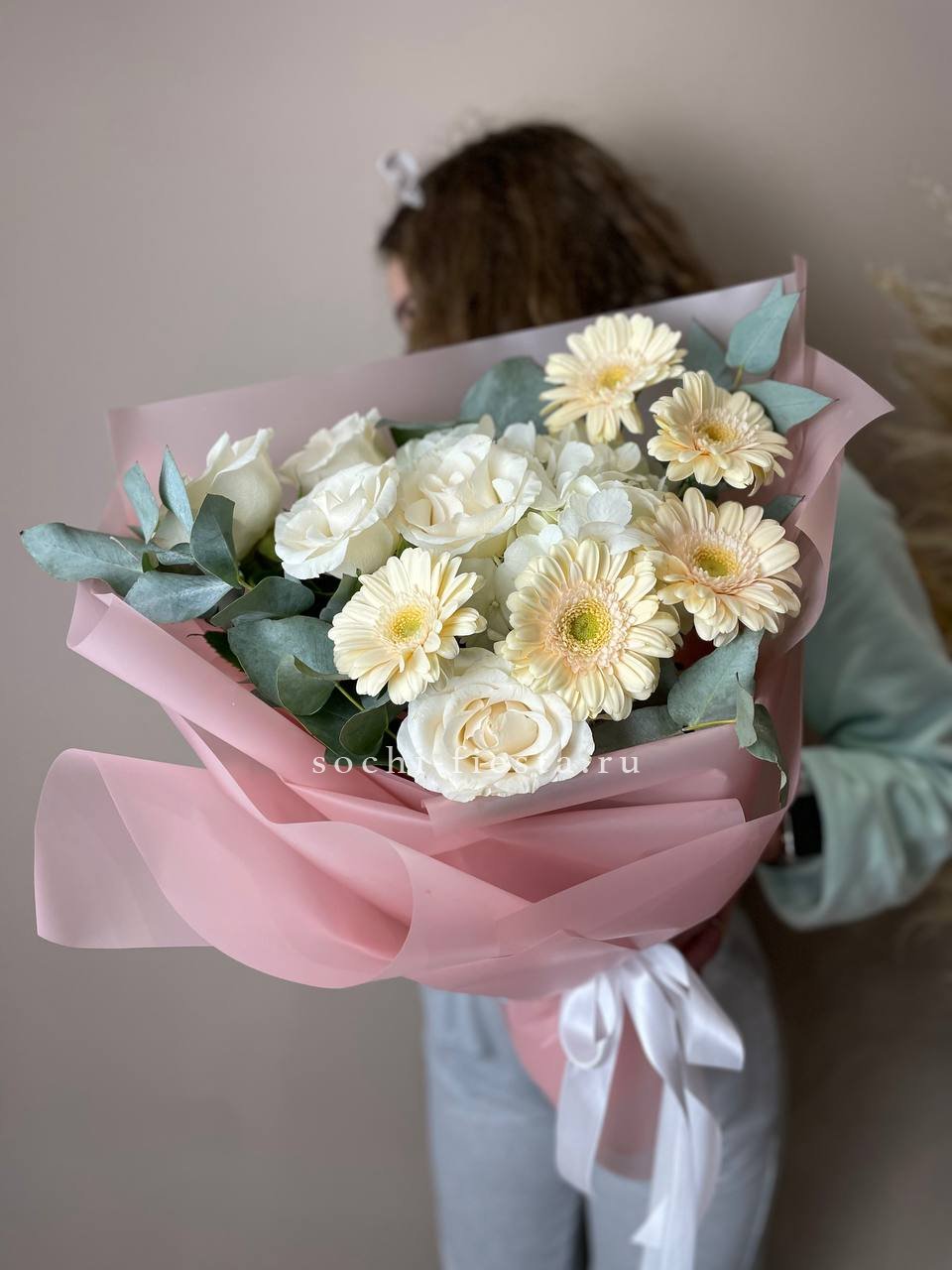 герберы, хризантемы, статица (аналог), диантусы, хлопок, упаковка.
