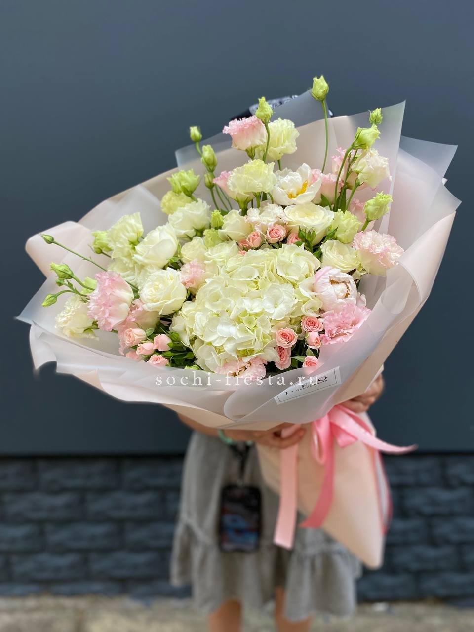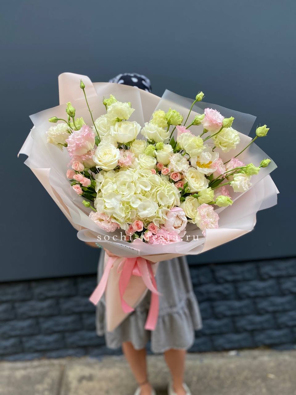 Плотные головки Мисти Бабблс раскрываются слоями и создают объёмную текстуру рядом с классическими бутонами. Белый и розовый перетекают друг в друга без резких границ. Композиция собрана в обёртку с графичным рисунком для современной подачи.