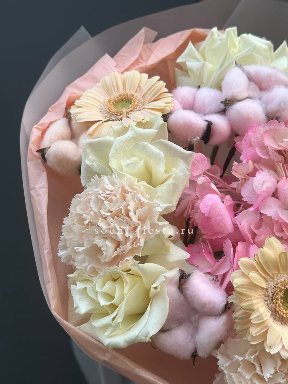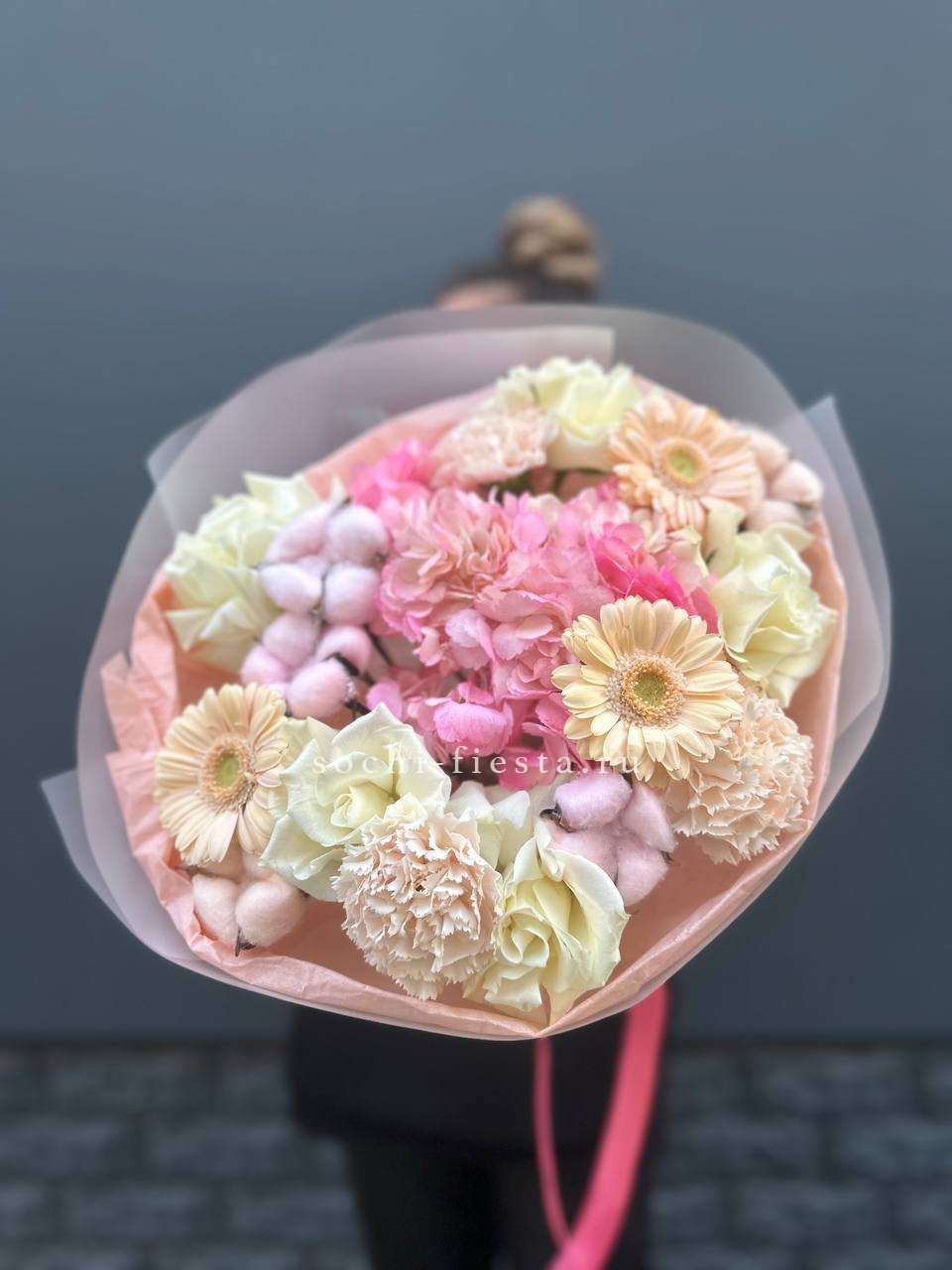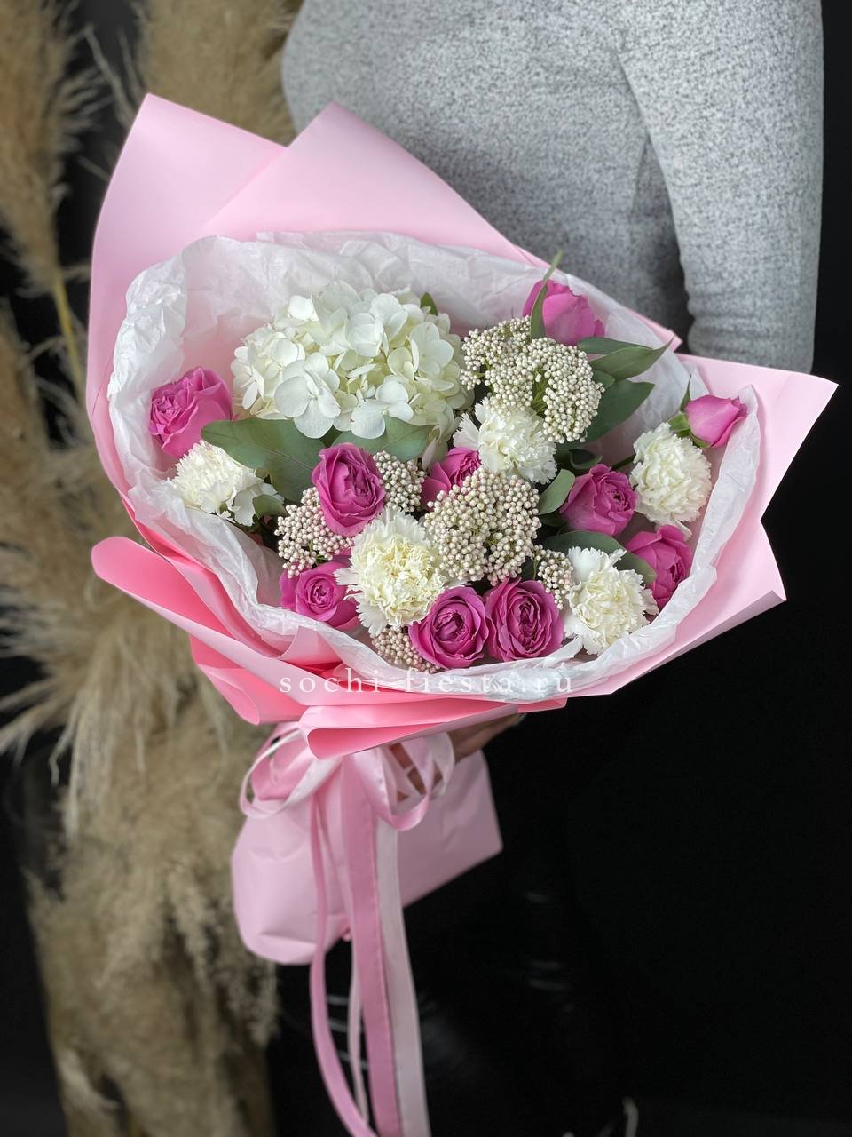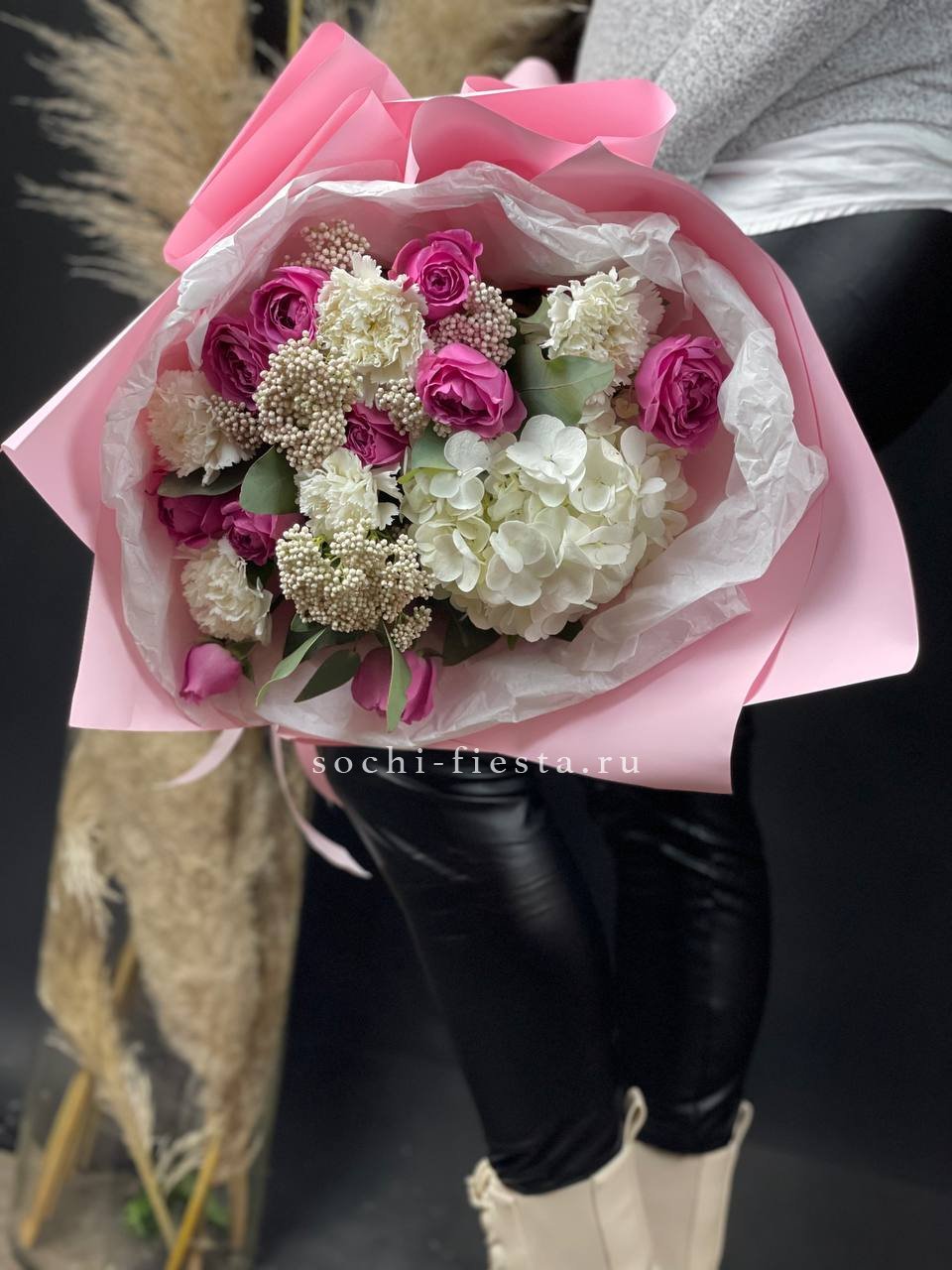 гортензия, диантус, хризантема, эустома, розы, озатамус, пленка.
