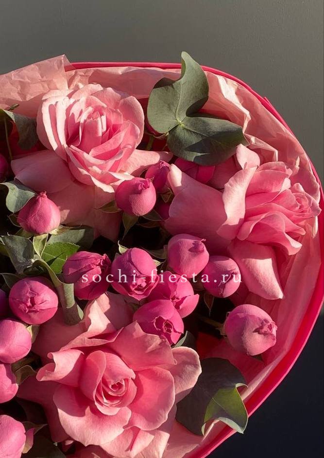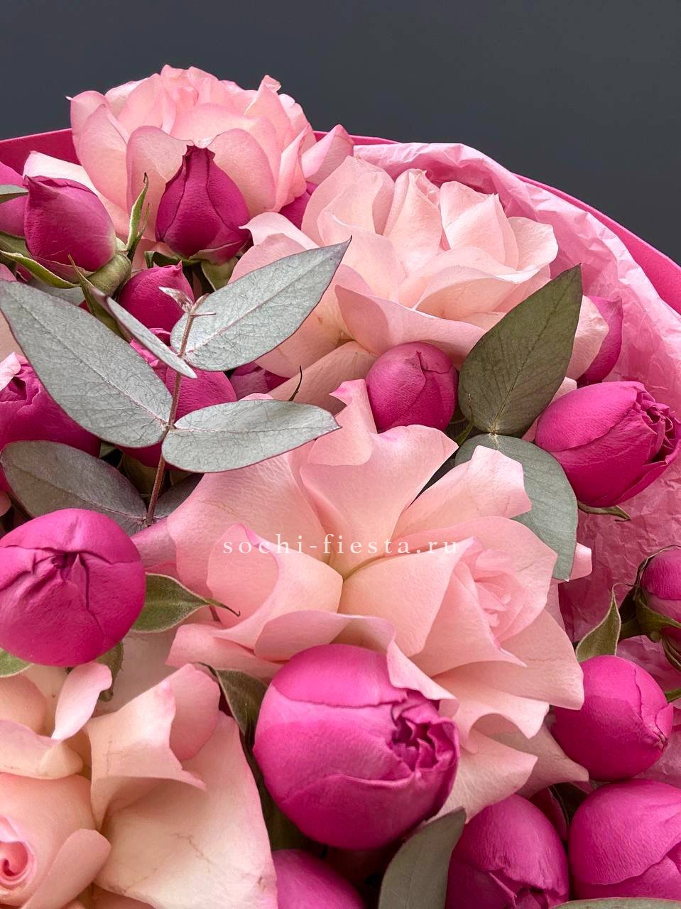 роза одноголовая, диантус, кустовые розы, сопутствующие сезонные цветы, лента, дизайнерская упаковка.