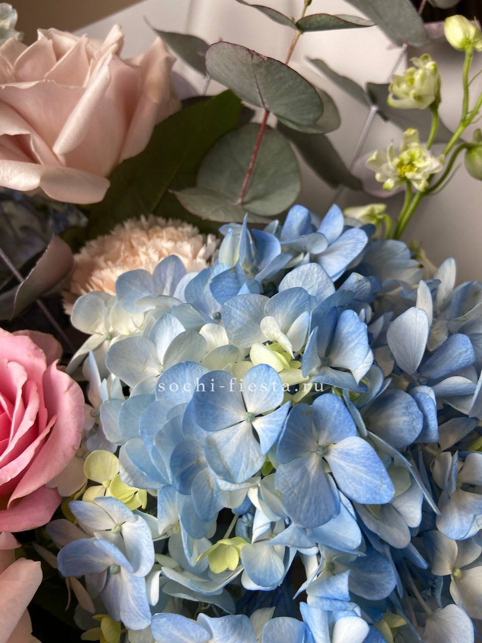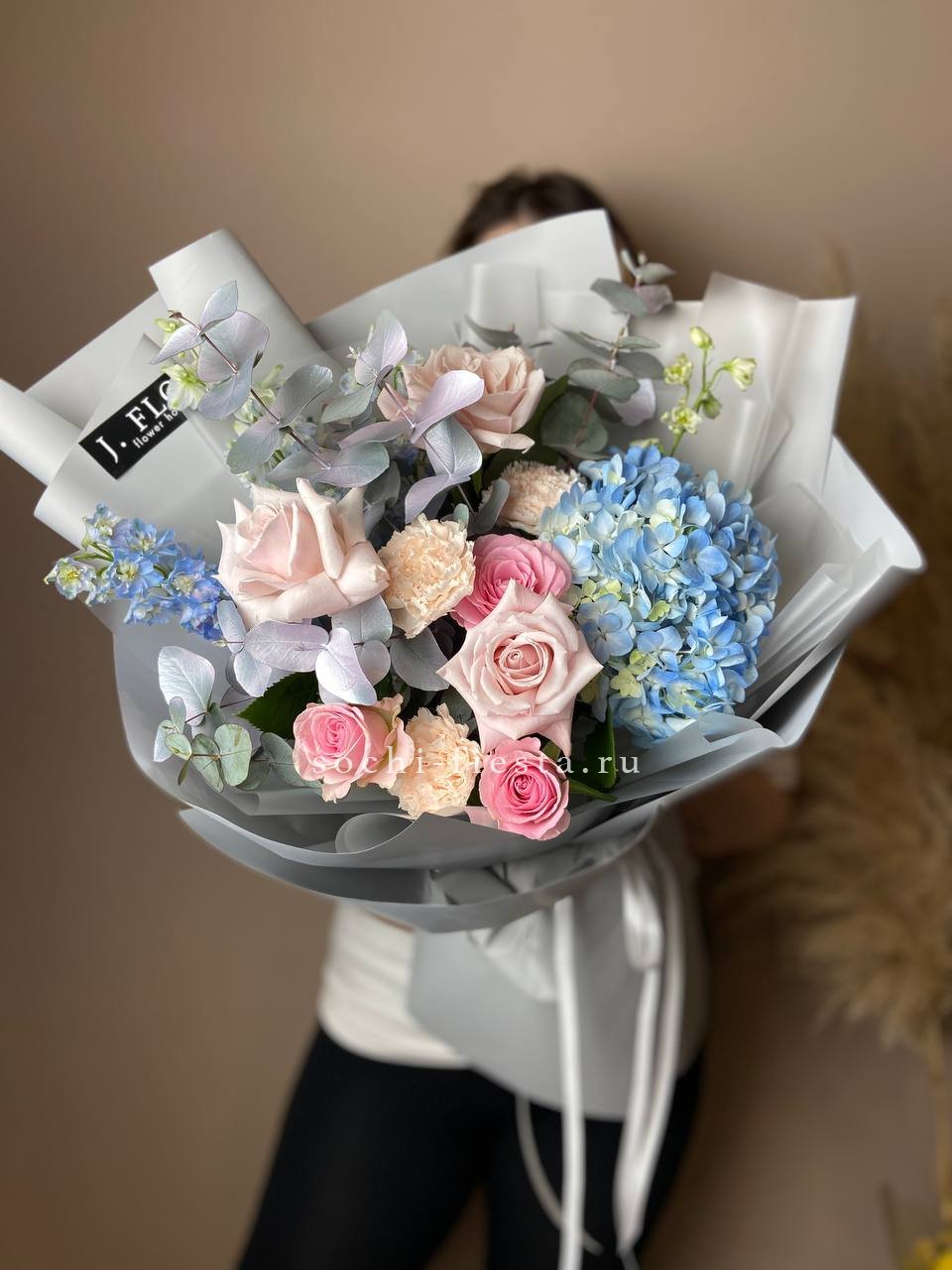 Воздушная композиция в пастельных тонах с пионовидными розами и гортензией создает объемную форму. Каждый бутон раскрывается слоями, а диантусы добавляют графичные точки среди крупных соцветий.