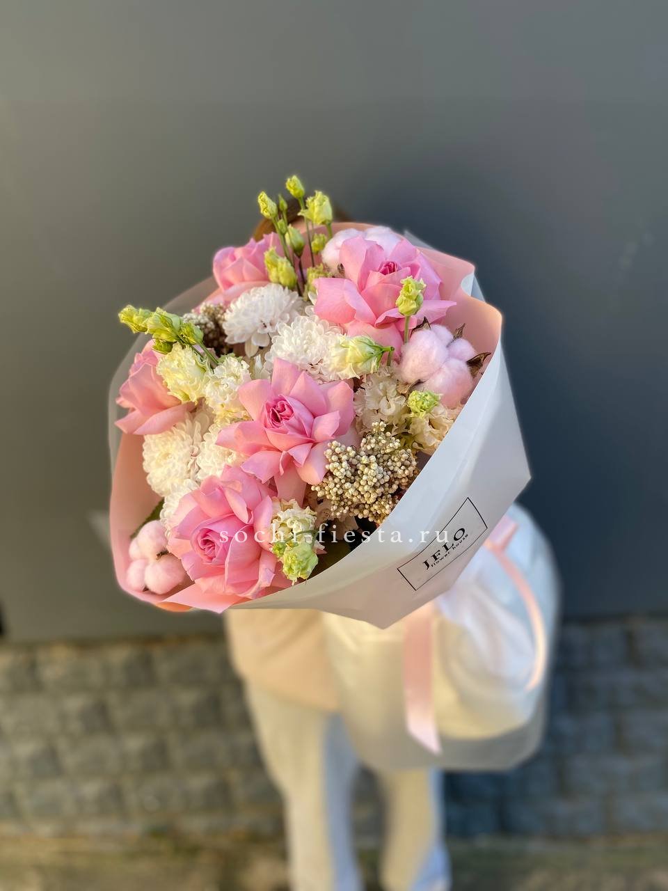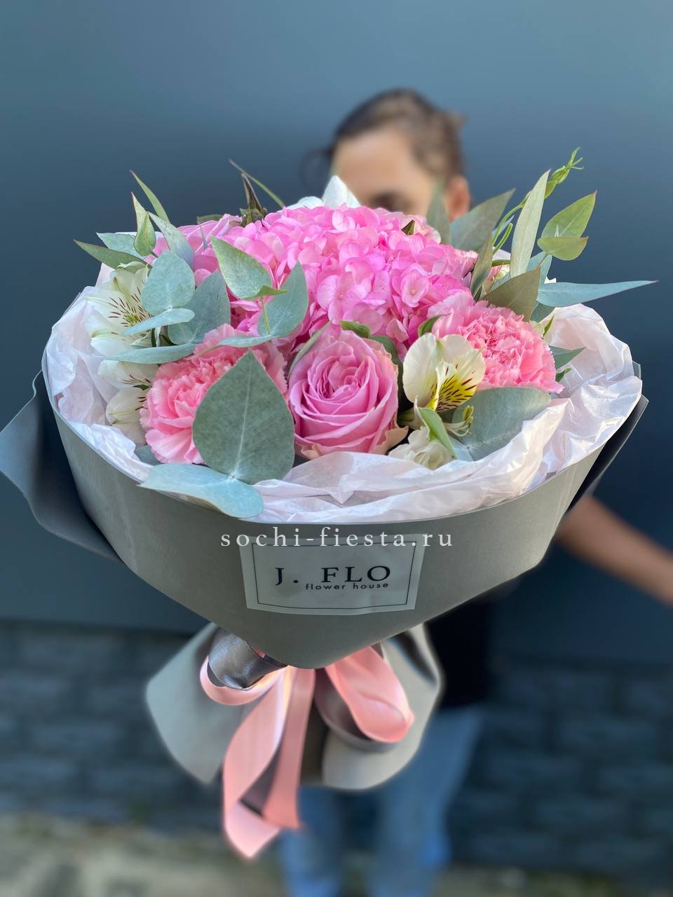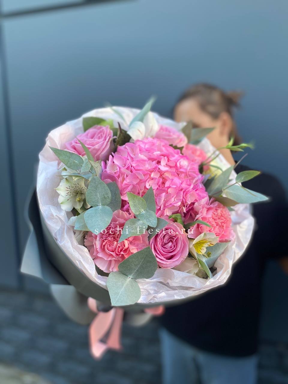 гортензия, герберы, розы, диантусы, хлопок,  авторское оформление.