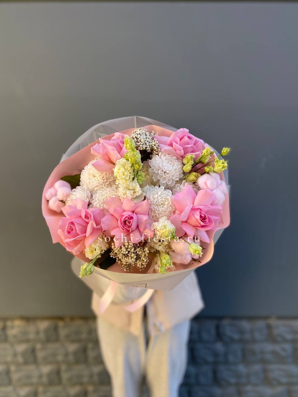 Пушистые соцветия гортензии сливаются с мягким хлопком и формируют объёмное облако. Герберы и диантусы вносят цветовые акценты, а розы завершают романтичную картину.