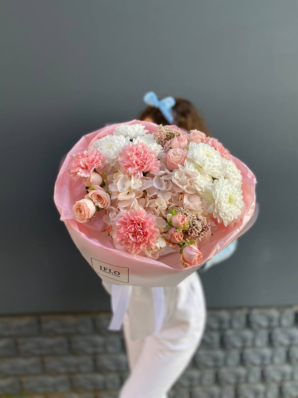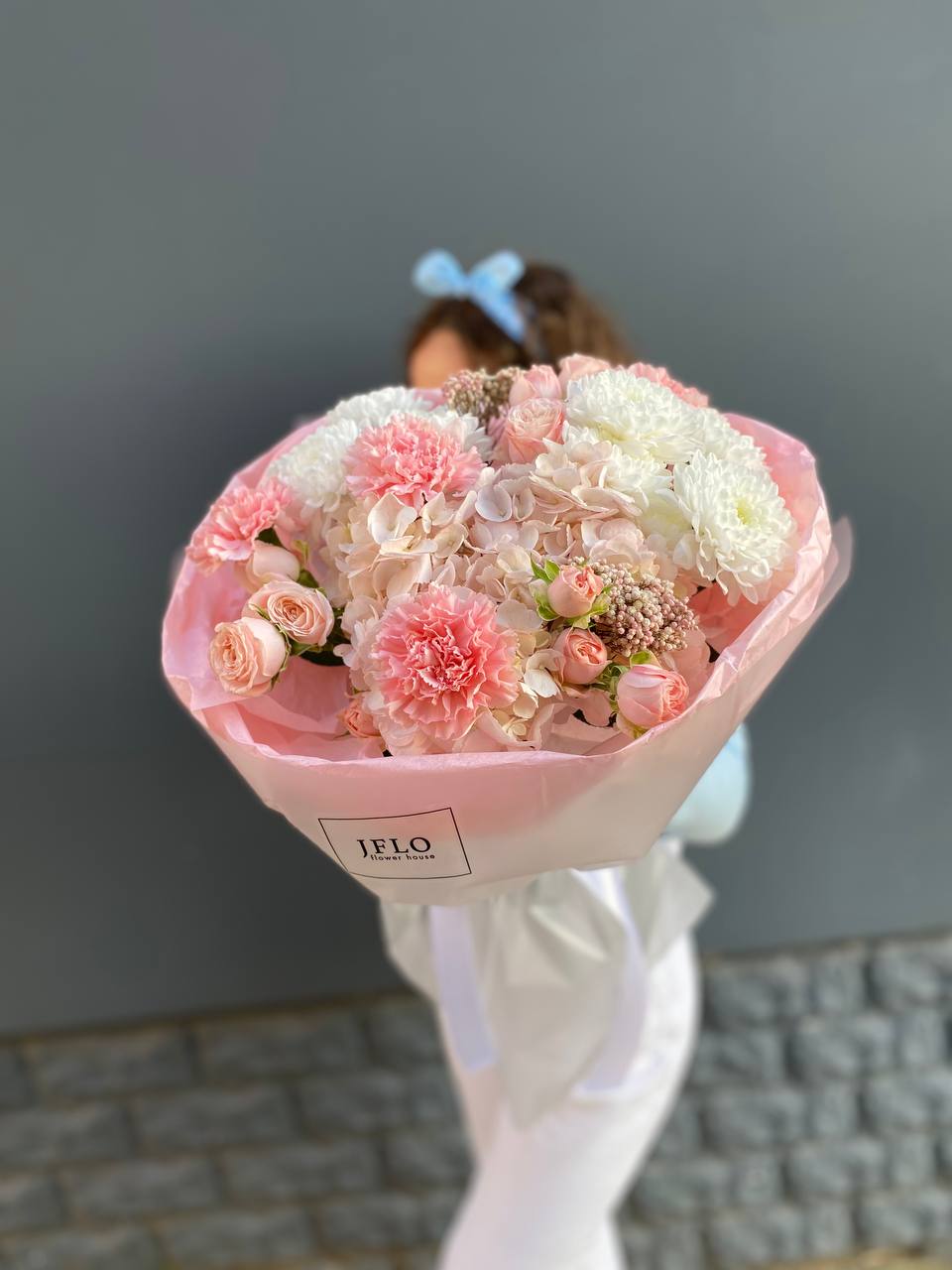 гортензия, пионы, кустовые пионовидные розы, одноголовые розы, дельфиниум (или аналог вне сезона), лента, дизайнерская упаковка.