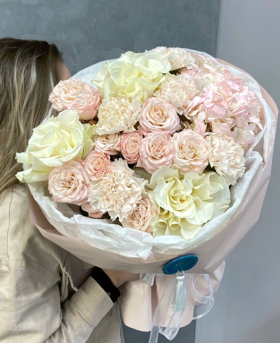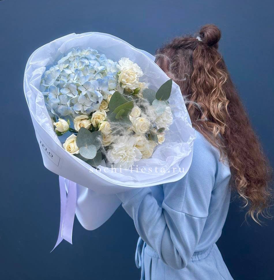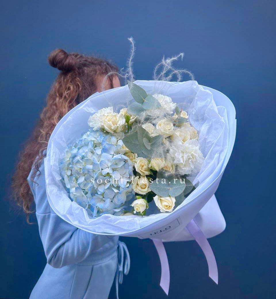 гортензия, пионовидная роза, озотамус, белая роза в нежном оформлении.
