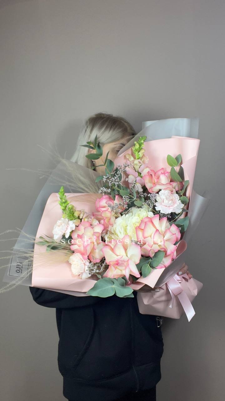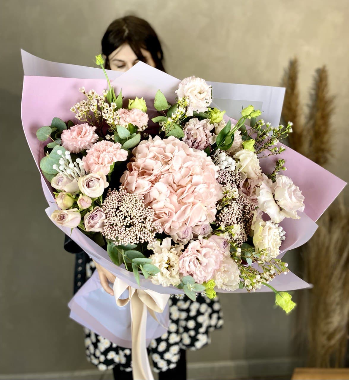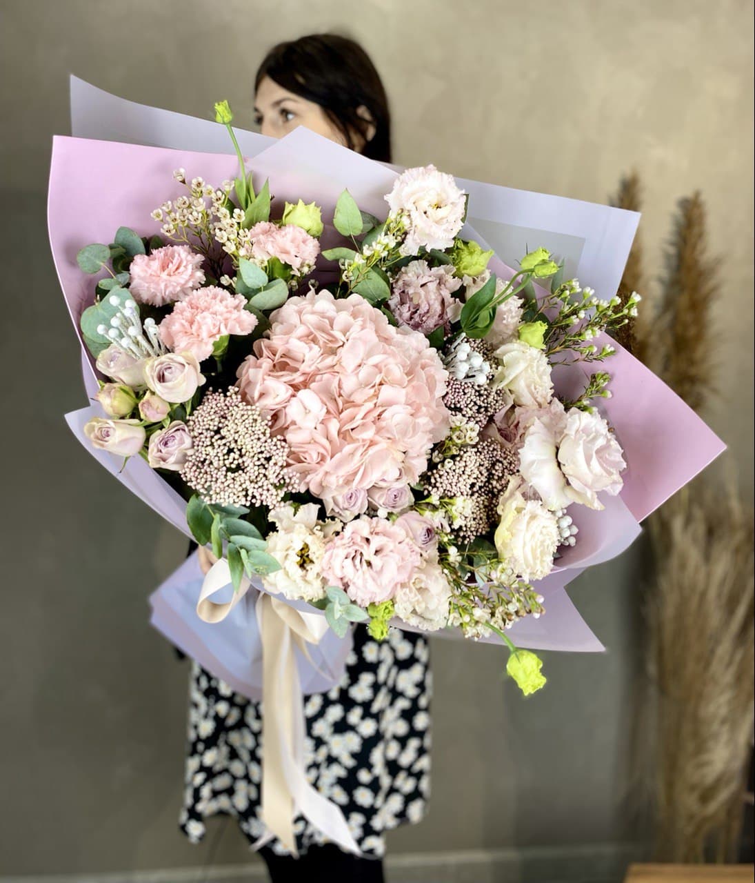 Плотная сборка с пышной гортензией в центре и рассыпчатыми соцветиями диантуса по краям. Эустома добавляет воздушности, а ветки озатамуса создают лёгкую графику. Букет держит форму и выглядит объёмно с любого ракурса.