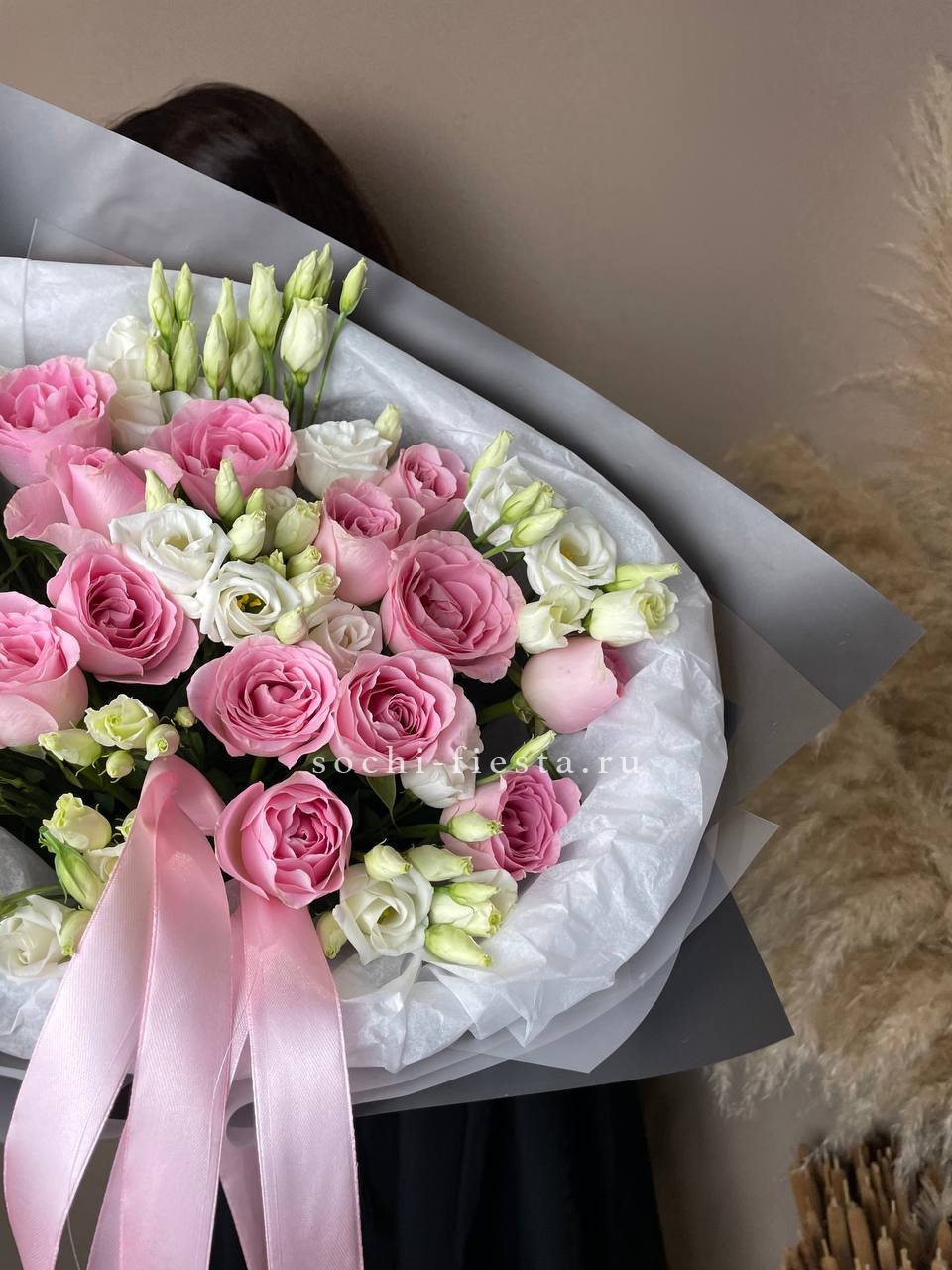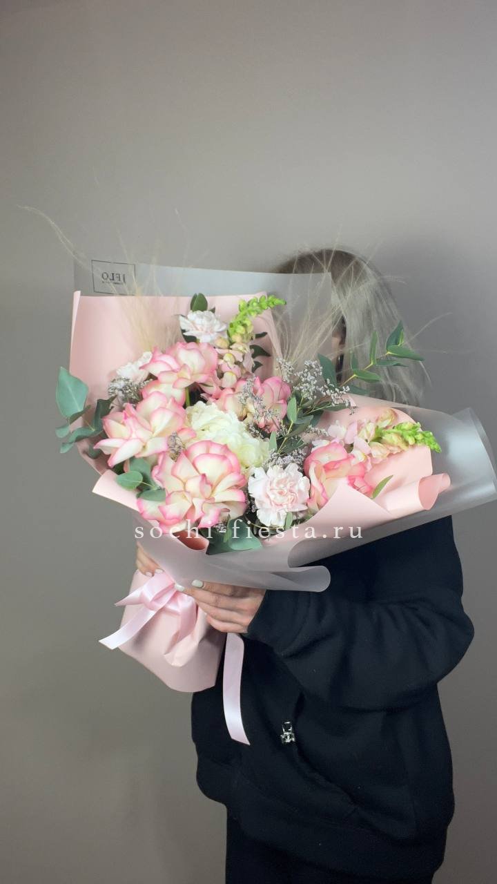 диантус, эустома, гортензия, хайди, эвкалипт, озатамус, пленка.