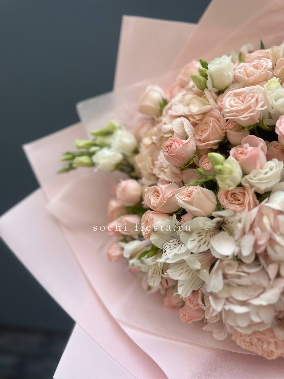 кустовые розы, эустомы, гортензии, альстромерии, лента и дизайнерская пленка.