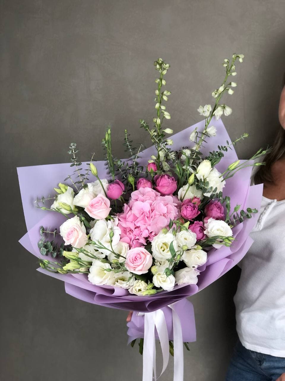 гортензия, розы, эустома, кустовая пионовидная роза, эвкалипт, лента, дизайнерская упаковка.