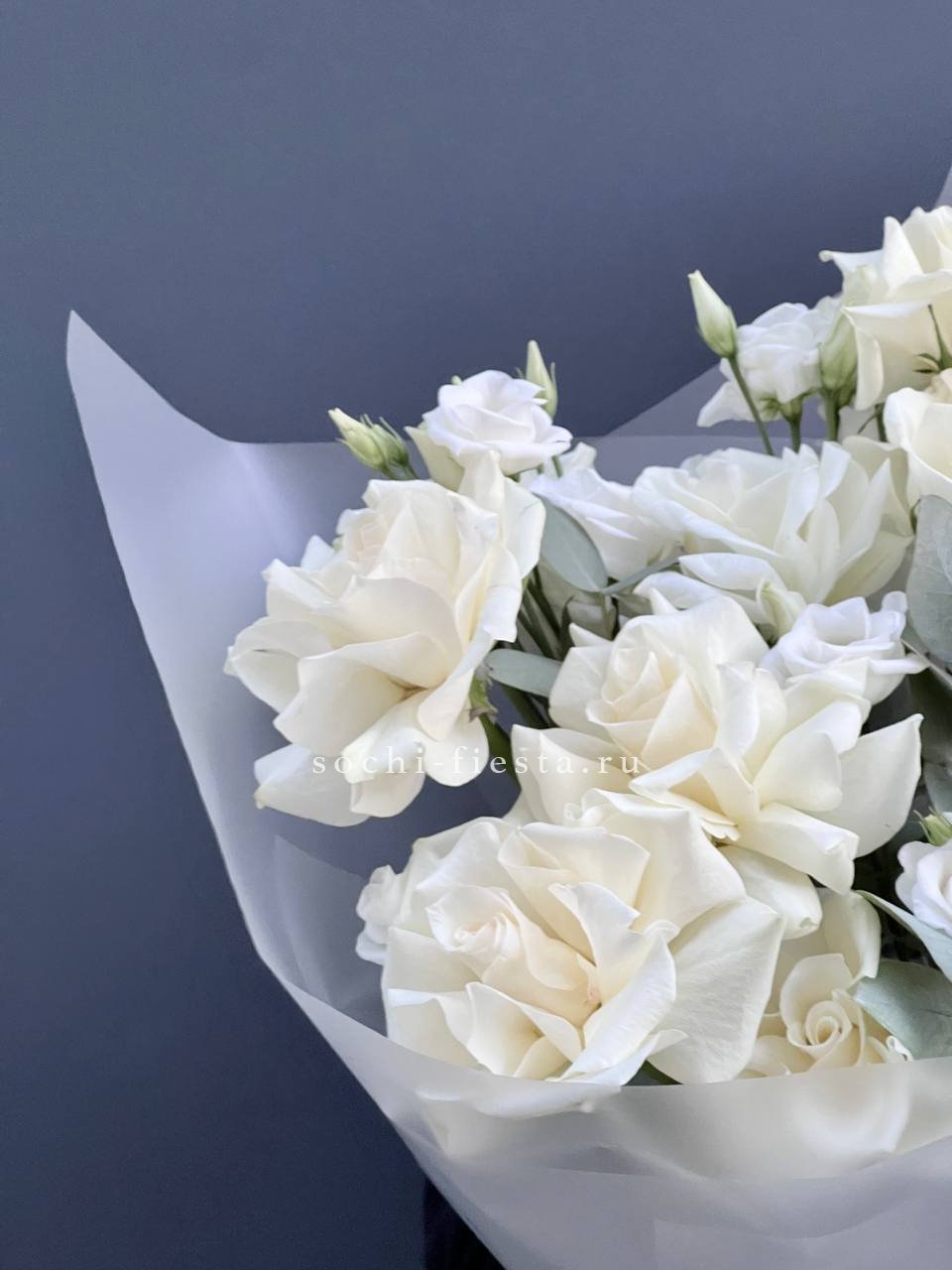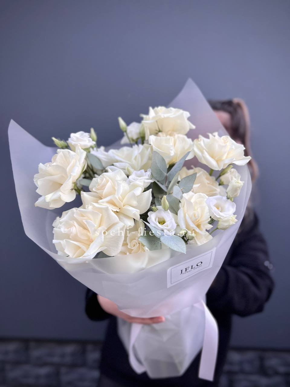 Пионовидные розы раскрываются широкими бутонами среди воздушных соцветий гортензии и многолепестковой эустомы. Эвкалипт добавляет свежести линиям, а дизайнерская упаковка завершает композицию.