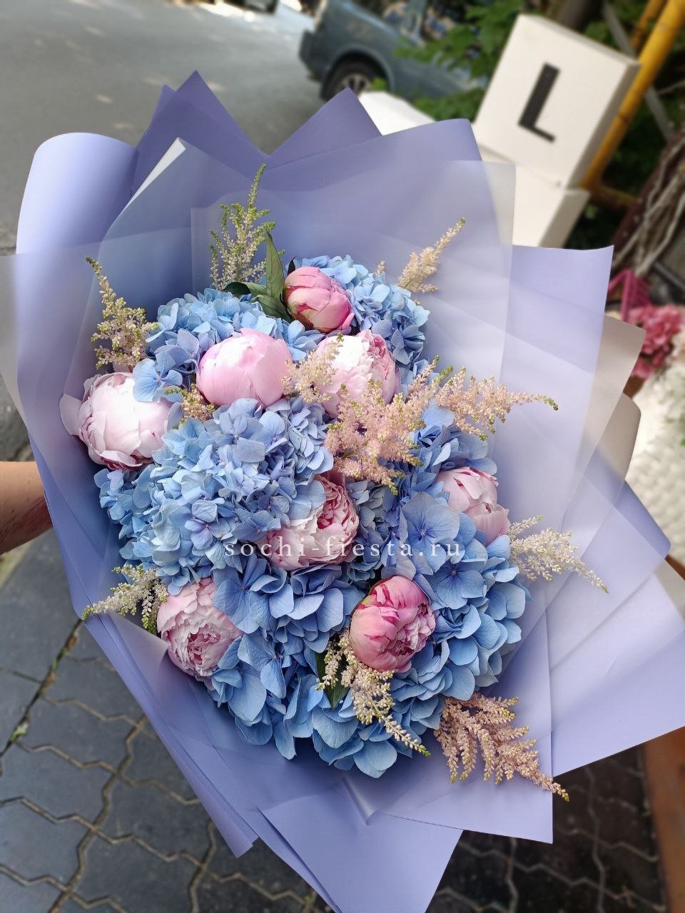 пионы, гортензия, статица (или аналог), лента, дизайнерская упаковка.