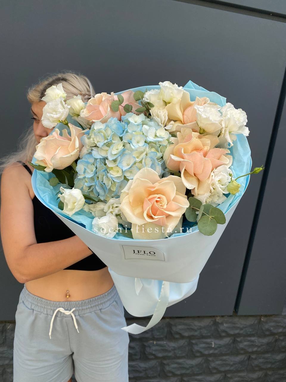 Кремовые розы окружены облаками гортензии, а эустома расставляет светлые акценты по краям. Букет держит форму и при этом выглядит объемно благодаря многослойной сборке.