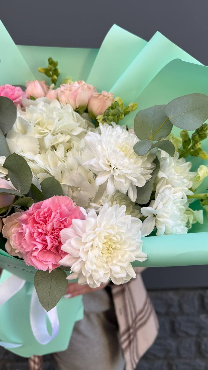 Компактная композиция с четким ритмом бутонов и легкой подачей. Гвоздики и розы собраны в аккуратную форму, удобную для размещения в любом пространстве.