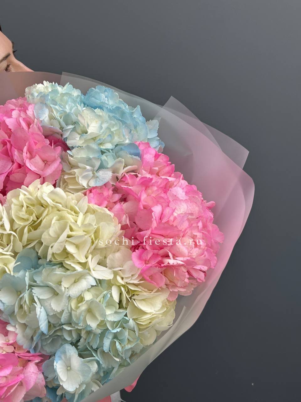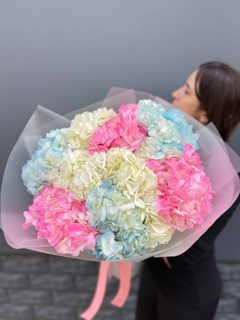 диантусы, розы, эустома, гортензия, эвкалипт, вспомогательные цветы, лента, корейская пленка.