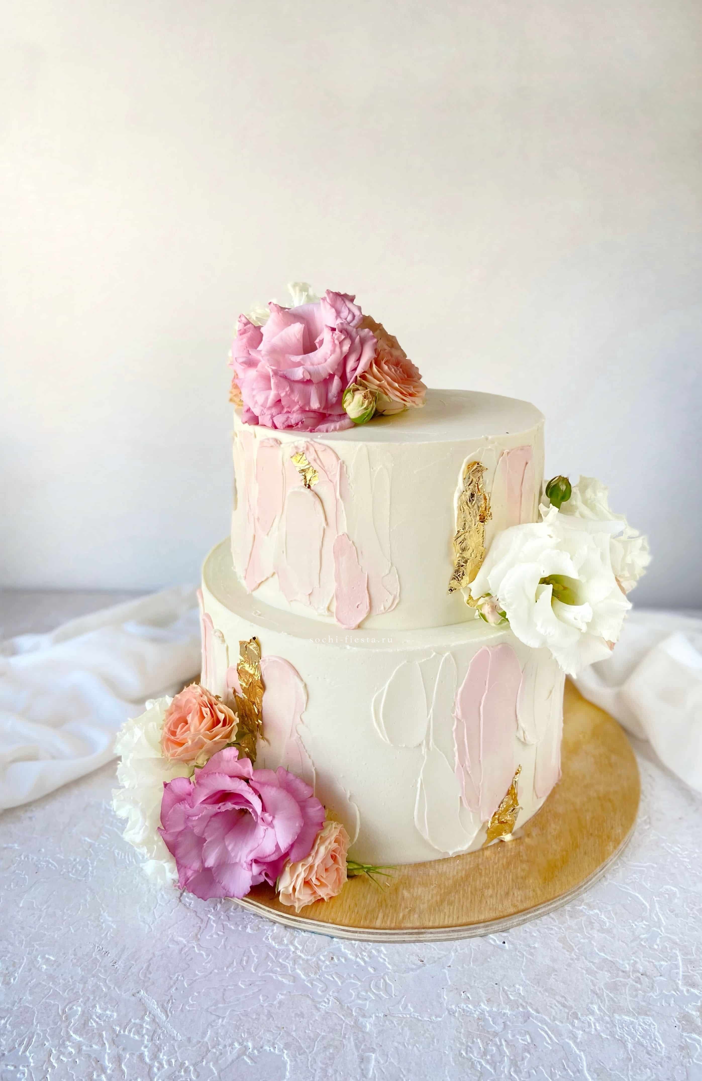 Золотые сердца на белоснежной поверхности задают графичный ритм композиции. Двухкилограммовый торт впечатляет объемом и предлагает три варианта начинки на выбор. Декор включен и продуман до мелочей.