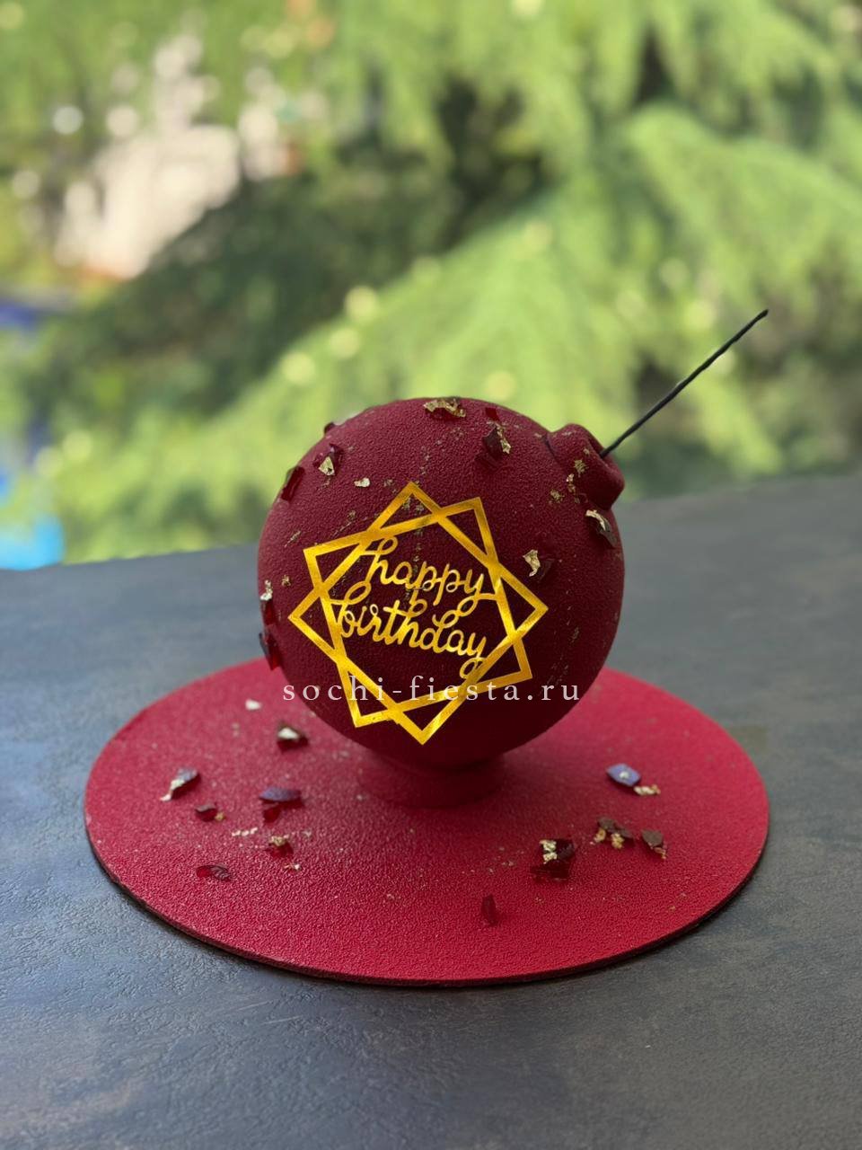 Сферическая форма торта напоминает бомбу с ярким визуальным эффектом. Ручная работа видна в каждой детали этой необычной конструкции.