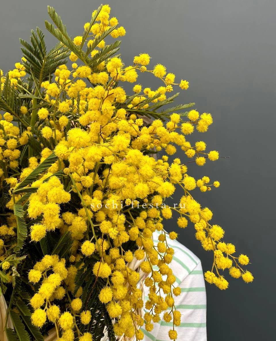 Солнечные шары мимозы собраны в пышную корзину. Яркий жёлтый цвет мгновенно поднимает настроение и напоминает о первых тёплых днях.